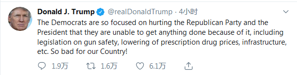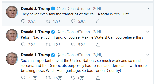 特朗普在推特上回应称“民主党人如此专注于伤害共和党和总统,以至于他们无法做任何事情,包括枪支安全立法,降低处方药价格,基础设施等。这对我们国家来说太糟糕了!”特朗普随后又说,“在联合国如此重要的一天,如此多的工作和如此多的成功,而民主党人故意用更多的垃圾新闻和猎巫行动来破坏和贬低这一天。这对我们国家来说太糟糕了!”