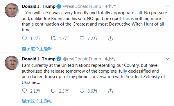 特朗普24日还表示,他将于当地时间25日公布与泽连斯基的通话记录全文。他说:“我目前正在联合国代表我们的国家,但已授权明天(25日)公布我与乌克兰总统泽连斯基通话的完整的、完全解密的和未编辑的文字记录。你会看到这是一个非常友好和完全适当的通话。没有压力,不像乔·拜登和他的儿子,没有交换!这只不过是有史以来最伟大和最具破坏性的猎巫行动的延续!”