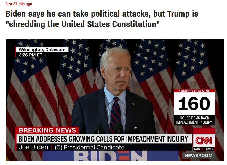 不过,对特朗普展开正式弹劾调查,可能对拜登来说也并非好消息。《华盛顿邮报》称,一些民主党参选人会因为政治正确站在拜登一边,但另一些人会质疑拜登是否是对抗特朗普的最佳人选。“乌克兰丑闻可能既毁了特朗普,也毁了民主党”,美国“国会山”网站评论说,特朗普3年前还是共和党总统提名人时曾说,如果美国总统利用职权调查一名反对党的总统提名人,将是美国史上最大的丑闻,恶劣程度甚于“水门事件”。当时他是在谴责对他与俄罗斯往来的调查。而对于拜登来说,任何对特朗普的弹劾程序都会凸显亨特和乌克兰可能的交易,毕竟没有人认为,乌克兰接近亨特是因为他的才华。