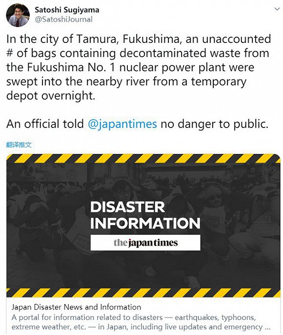 周日,福岛县田村市当局宣布,该市存储福岛第一核电站除污废料袋的临时存储区被洪水淹没,部分经过除污处理的废料袋被冲入河中。