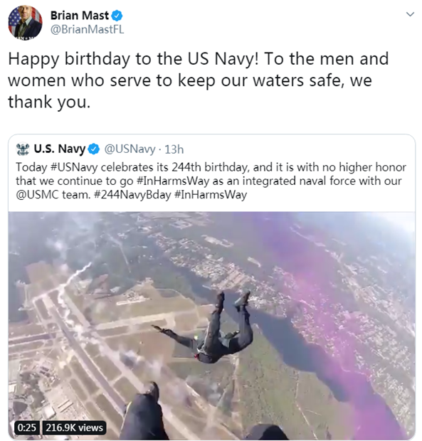 10月13日是美国海军成立244周年纪念日,庆祝活动也如期举行。然而,美国众议员布莱恩·马斯特的一条祝福推特却成了当天最大的乌龙。