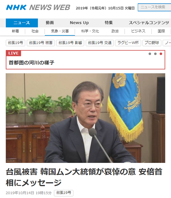 据日本广播协会(NHK)14日报道,韩国总统文在寅于当日通过外交途径向安倍致信,向台风遇难者致以“沉痛的哀悼与深切的慰劳”。此外,文在寅还表示:“希望日本政府和国民齐心合力,妥善处理灾情,同时也希望许多受害的日本国民能够早日恢复平静的日常生活。”