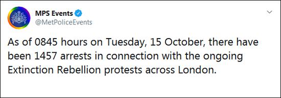 据伦敦警察厅消息,截至当地时间15日上午8时45分,共有1457名“反抗灭绝”示威者被捕。